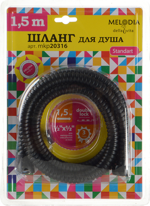Шланг для душа MELODIA 1/2""*1/2"" конус, ПВХ с оплеткой из нержавеющей стали, диаметр 14 мм, длина 150 см STANDART, с двойным зажимом. Цвет Black, упакован в блистер. Используется совместно с душевыми или гигиеническими смесителями, а также душевыми лейками. Присоединение к смесителю с помощью накидной гайки 1/2"" (16 мм), а к лейке - с помощью конусной накидной гайки 1/2"" (16 мм). Шланг подходит к импортным смесителям и лейкам.