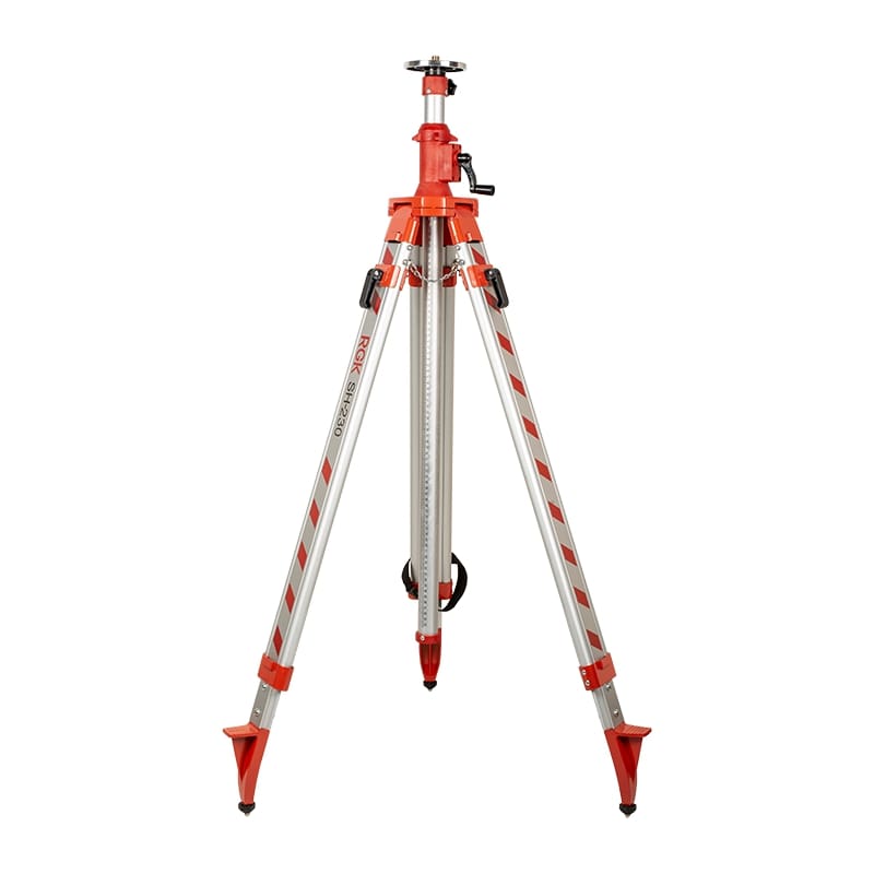 Эта модель одинаково хорошо подходит для применения в помещении и на улице. Ножки устройства снабжены прочными металлическими упорами для установки на грунт и резиновыми наконечниками, которые совместно с цепями предотвращают скольжение на гладких поверхностях. Раздвижной механизм стоек фиксируется в нужном положении специальными клипсами. Штатив для лазерного нивелира RGK SH-230 изготовлен из прочного алюминия, не подверженного коррозии.