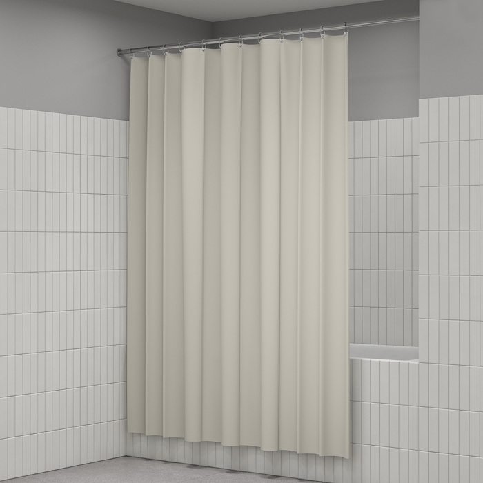 Размер (ВхШ): 200х180 см. Материал: 100% полиэстер, плотность 90 г/м, водоотталкивающая пропитка, прозрачные пластиковые люверсы, 12 прозрачных пластиковых колец, форма "С", утяжеляющая нить, упаковка ПВХ пакет, картонный топпер, пластиковый крючок. Цвет - бежевый