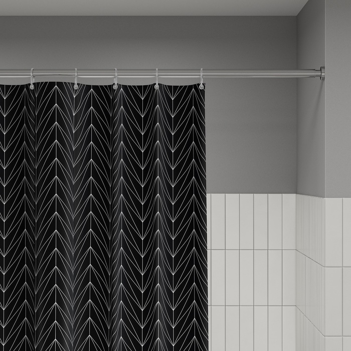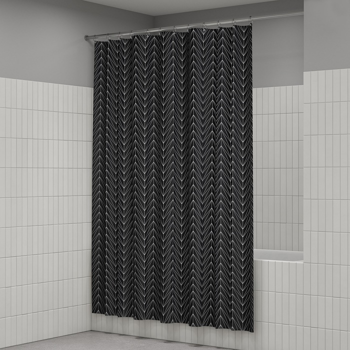 Размер (ВхШ): 200х180 см. Материал: 100% полиэстер, плотность 80 г/м, водоотталкивающая пропитка, прозрачные пластиковые люверсы, 12 прозрачных пластиковых колец, форма "С", утяжеляющая нить, упаковка ПВХ пакет, картонный топпер, пластиковый крючок.
