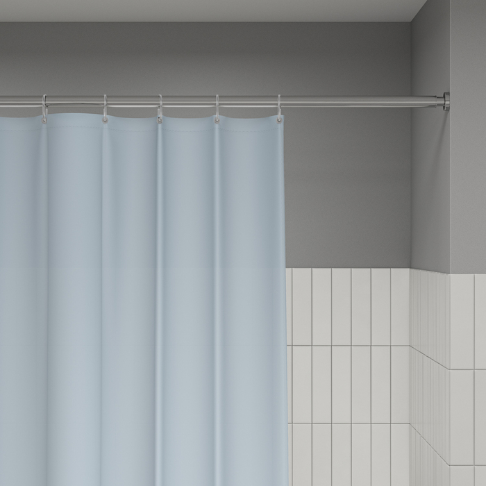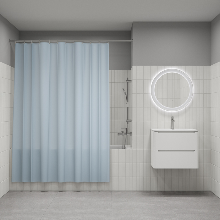Размер (ВхШ): 200х180 см. Материал: 100% полиэстер, плотность 90 г/м, водоотталкивающая пропитка, прозрачные пластиковые люверсы, 12 прозрачных пластиковых колец, форма "С", утяжеляющая нить, упаковка ПВХ пакет, картонный топпер, пластиковый крючок. Цвет - голубой