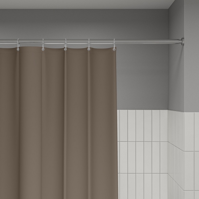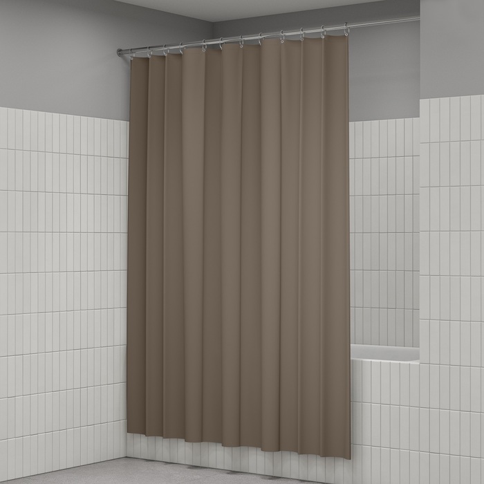 Размер (ВхШ): 200х180 см. Материал: 100% полиэстер, плотность 90 г/м, водоотталкивающая пропитка, прозрачные пластиковые люверсы, 12 прозрачных пластиковых колец, форма "С", утяжеляющая нить, упаковка ПВХ пакет, картонный топпер, пластиковый крючок. Цвет - коричневый