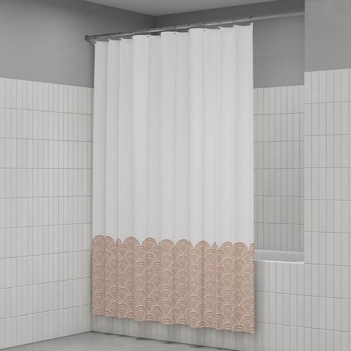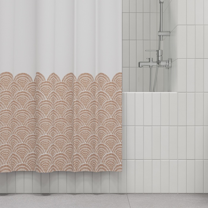 Размер (ВхШ): 200х180 см. Материал: 100% полиэстер, плотность 90 г/м, водоотталкивающая пропитка, прозрачные пластиковые люверсы, 12 прозрачных пластиковых колец, форма "С", утяжеляющая нить, упаковка ПВХ пакет, картонный топпер, пластиковый крючок. Цвет - коричневый