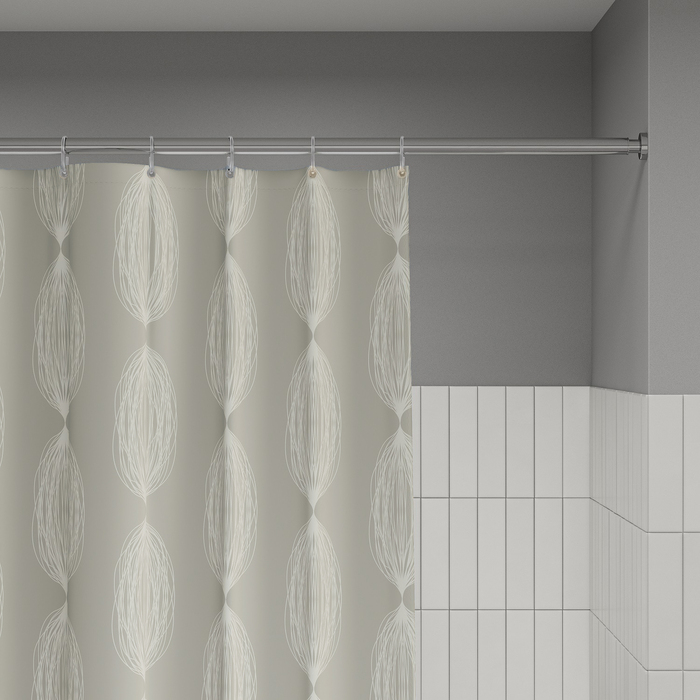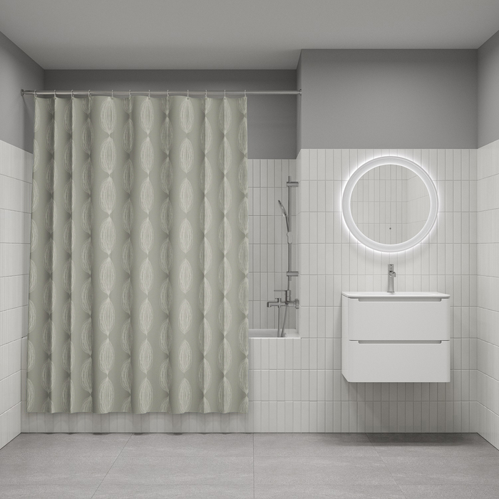 Размер (ВхШ): 200х180 см. Материал: 100% полиэстер, плотность 90 г/м, водоотталкивающая пропитка, прозрачные пластиковые люверсы, 12 прозрачных пластиковых колец, форма "С", утяжеляющая нить, упаковка ПВХ пакет, картонный топпер, пластиковый крючок.
