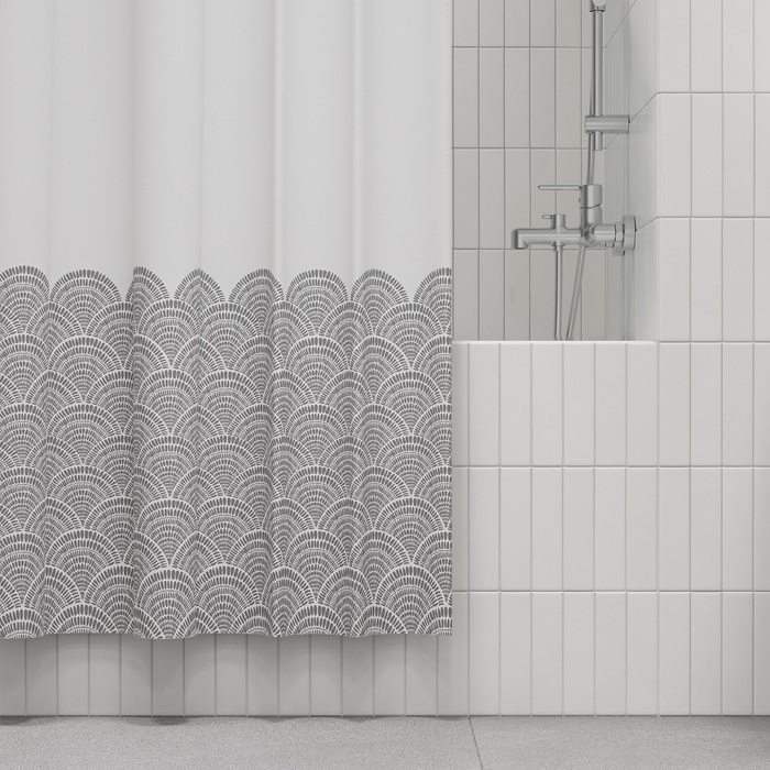 Размер (ВхШ): 200х180 см. Материал: 100% полиэстер, плотность 90 г/м, водоотталкивающая пропитка, прозрачные пластиковые люверсы, 12 прозрачных пластиковых колец, форма "С", утяжеляющая нить, упаковка ПВХ пакет, картонный топпер, пластиковый крючок. Цвет - серый