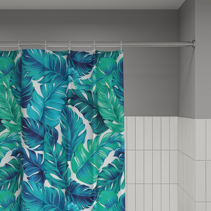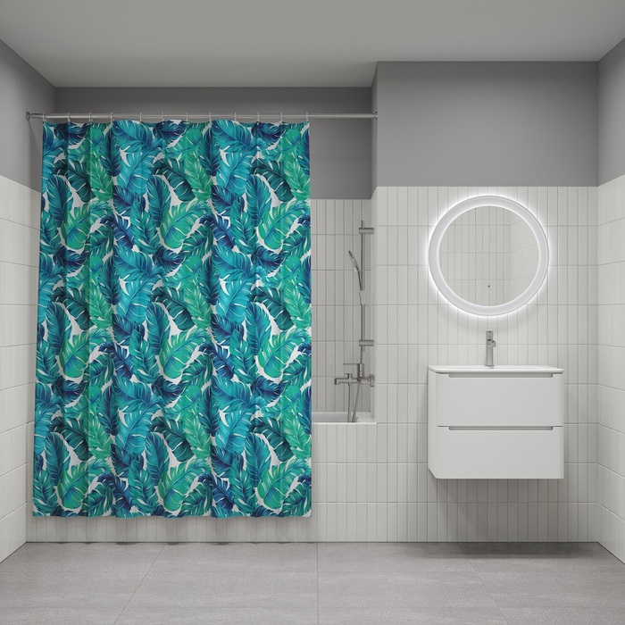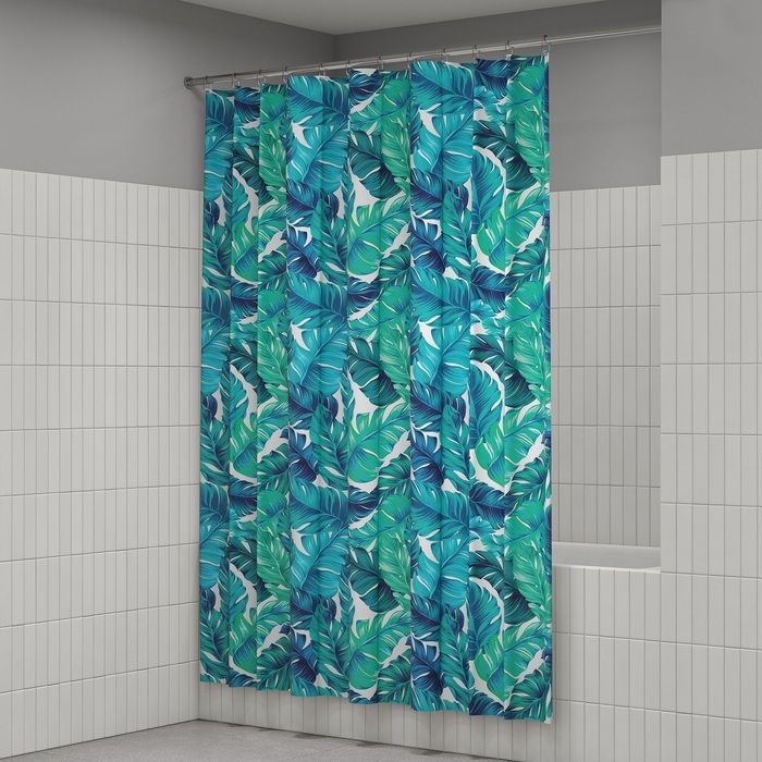 Размер (ВхШ): 200х180 см. Материал: 100% полиэстер, плотность 90 г/м, водоотталкивающая пропитка, прозрачные пластиковые люверсы, 12 прозрачных пластиковых колец, форма "С", утяжеляющая нить, упаковка ПВХ пакет, картонный топпер, пластиковый крючок.