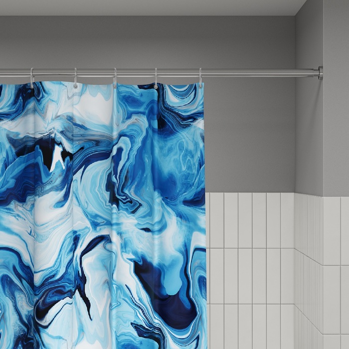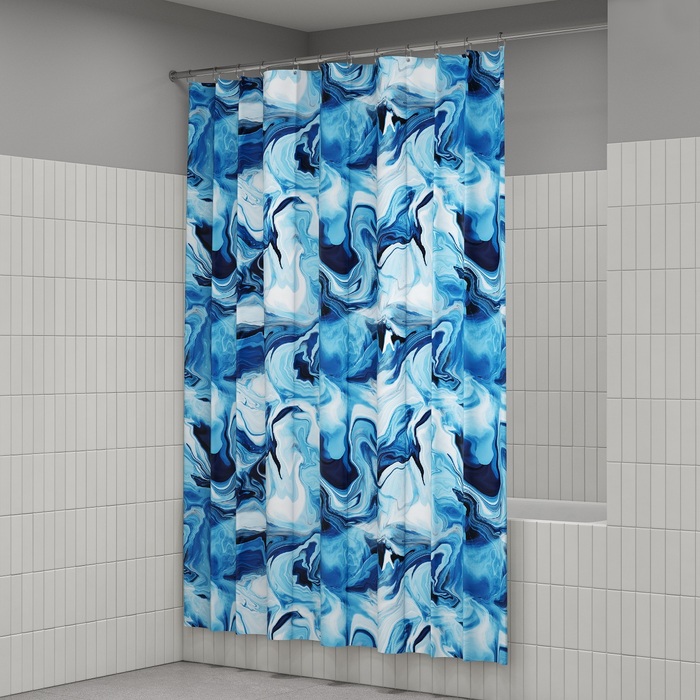 Размер (ВхШ): 200х180 см. Материал: 100% полиэстер, плотность 80 г/м, водоотталкивающая пропитка, прозрачные пластиковые люверсы, 12 прозрачных пластиковых колец, форма "С", утяжеляющая нить, упаковка ПВХ пакет, картонный топпер, пластиковый крючок.