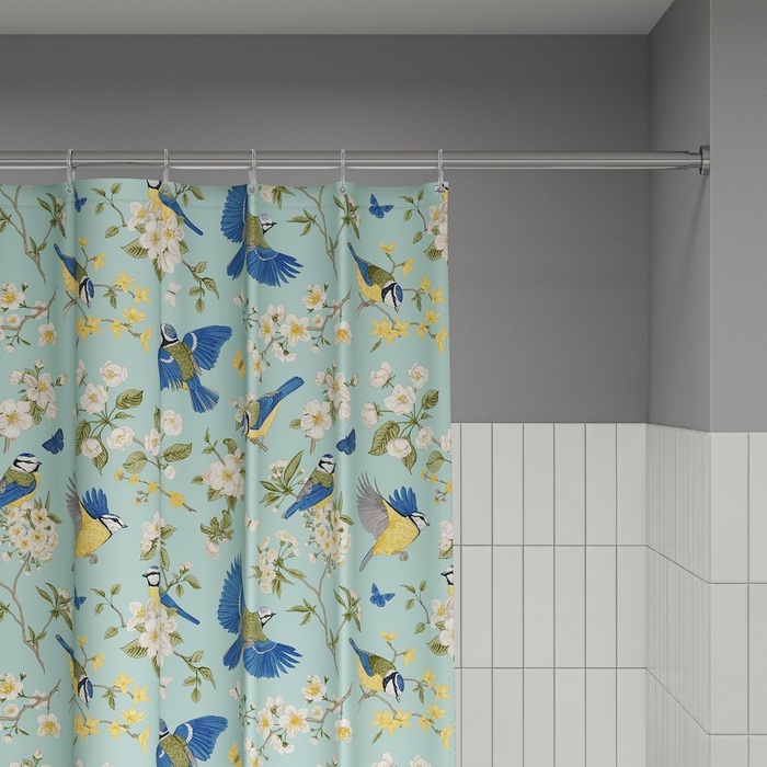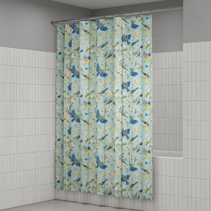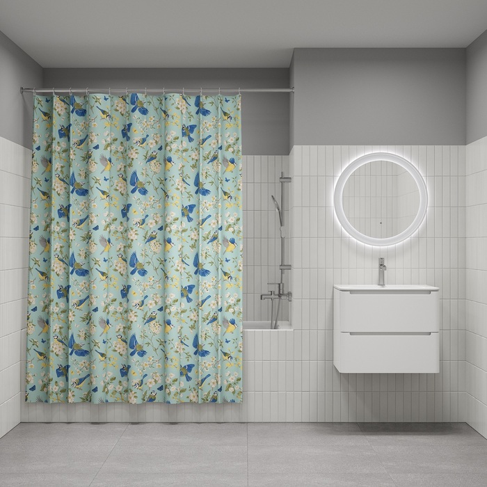 Размер (ВхШ): 200х180 см. Материал: 100% полиэстер, плотность 90 г/м, водоотталкивающая пропитка, прозрачные пластиковые люверсы, 12 прозрачных пластиковых колец, форма "С", утяжеляющая нить, упаковка ПВХ пакет, картонный топпер, пластиковый крючок.