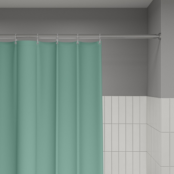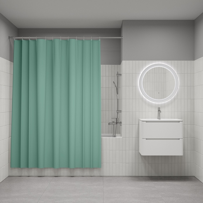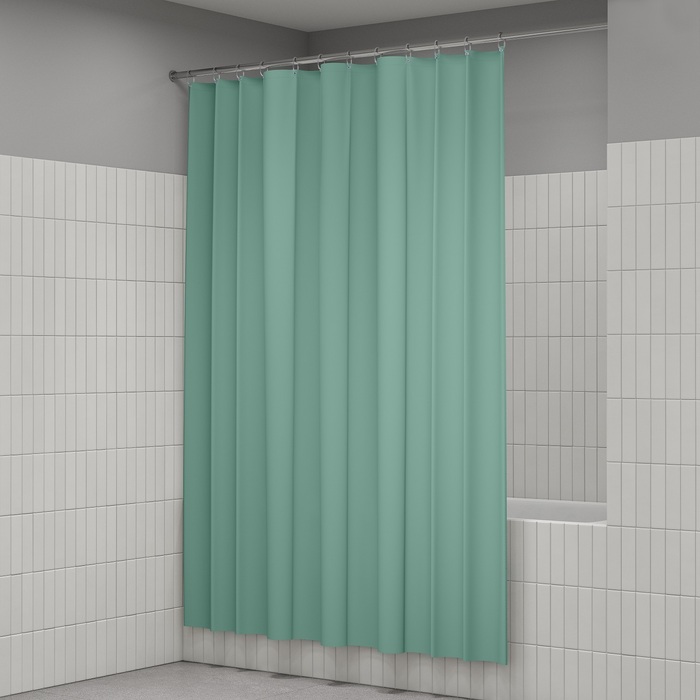 Размер (ВхШ): 200х180 см. Материал: 100% полиэстер, плотность 90 г/м, водоотталкивающая пропитка, прозрачные пластиковые люверсы, 12 прозрачных пластиковых колец, форма "С", утяжеляющая нить, упаковка ПВХ пакет, картонный топпер, пластиковый крючок. Цвет - зеленый