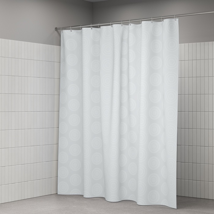 Размер (ВхШ): 200х240 см. Материал: 100% полиэстер, плотность 80 г/м, водоотталкивающая пропитка, прозрачные пластиковые люверсы, 12 прозрачных пластиковых колец, форма "С", утяжеляющая нить, упаковка ПВХ пакет, картонный топпер, пластиковый крючок.