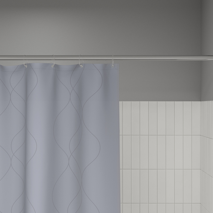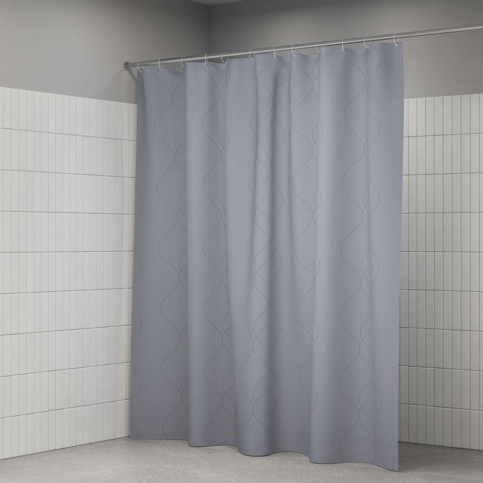 Размер (ВхШ): 200х240 см. Материал: 100% полиэстер, плотность 80 г/м, водоотталкивающая пропитка, прозрачные пластиковые люверсы, 12 прозрачных пластиковых колец, форма "С", утяжеляющая нить, упаковка ПВХ пакет, картонный топпер, пластиковый крючок.