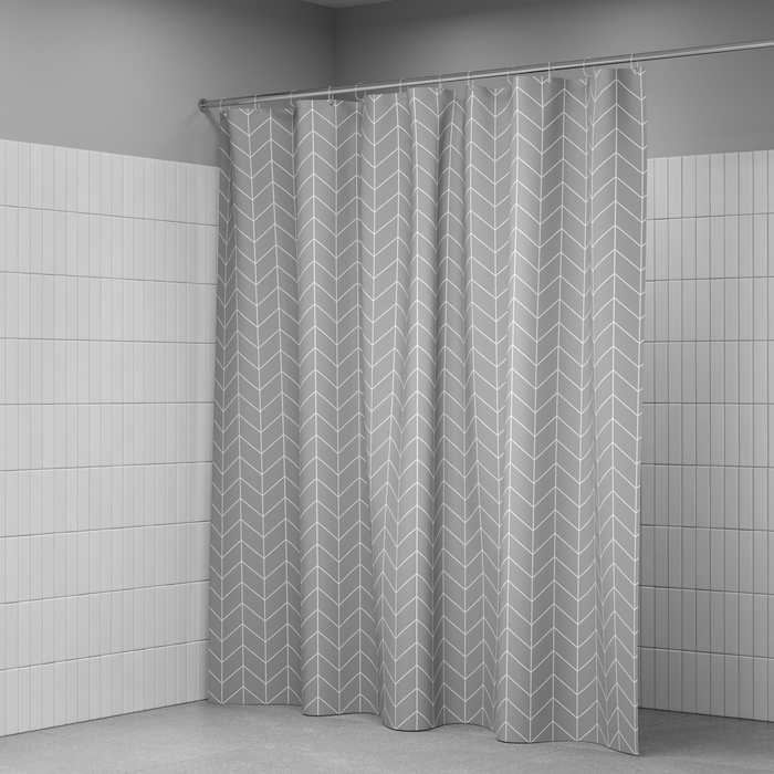 Размер (ВхШ): 200х240 см. Материал: 100% полиэстер, плотность 80 г/м, водоотталкивающая пропитка, прозрачные пластиковые люверсы, 12 прозрачных пластиковых колец, форма "С", утяжеляющая нить, упаковка ПВХ пакет, картонный топпер, пластиковый крючок.