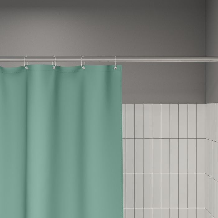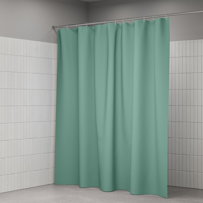 Размер (ВхШ): 200х240 см. Материал: 100% полиэстер, плотность 90 г/м, водоотталкивающая пропитка, прозрачные пластиковые люверсы, 12 прозрачных пластиковых колец, форма "С", утяжеляющая нить, упаковка ПВХ пакет, картонный топпер, пластиковый крючок. Цвет - зеленый