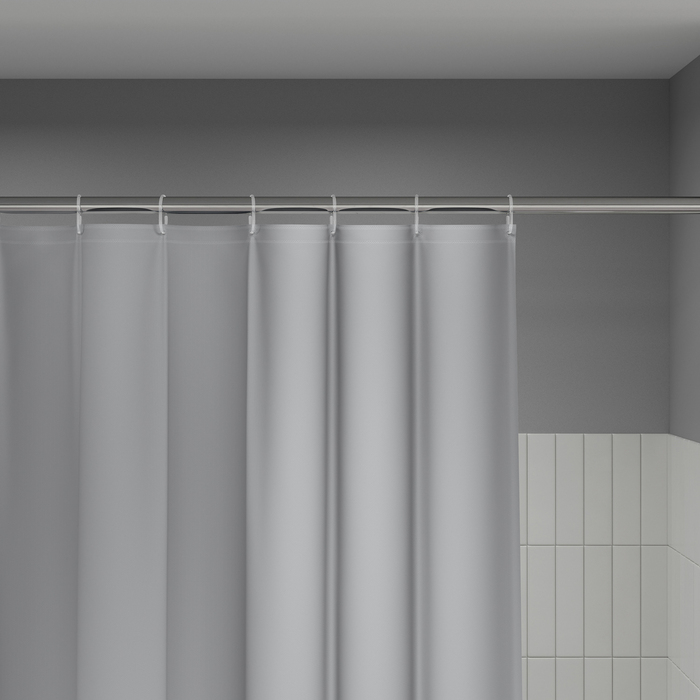 Размер (ВхШ): 200х180 см. Mматериал: PE, толщина 0,09 мм., штампованные люверсы, 12 прозрачных пластиковых колец, форма "С", упаковка ПВХ пакет, картонная лента, двойной крючок.