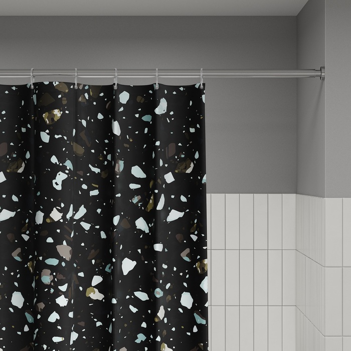 Размер (ВхШ): 200х180 см. Mматериал: 100% полиэстер, плотность 80 г/м, водоотталкивающая пропитка, прозрачные пластиковые люверсы, 12 прозрачных пластиковых колец, форма "С", утяжеляющая нить, упаковка ПВХ пакет, картонный топпер, пластиковый крючок.
