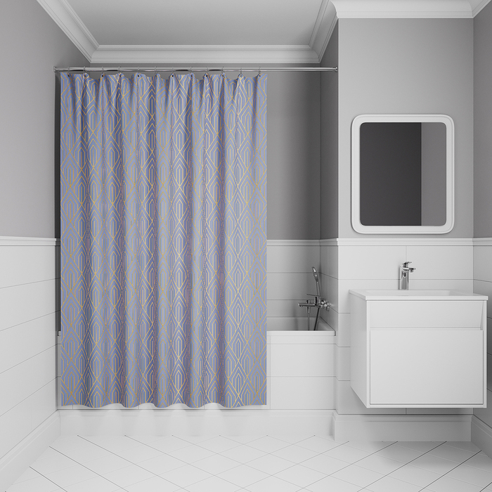 Размер (ВхШ): 200х180 см. Mматериал: 100% полиэстер, плотность 80 г/м, водоотталкивающая пропитка, прозрачные пластиковые люверсы, 12 прозрачных пластиковых колец, форма "С", утяжеляющая нить, упаковка ПВХ пакет, картонный топпер, пластиковый крючок.