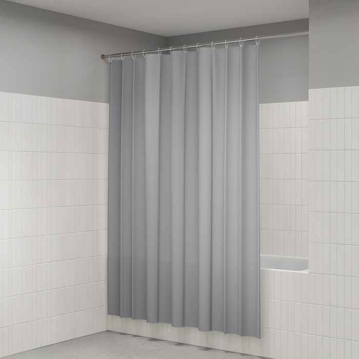 Размер (ВхШ): 200х180 см. Mматериал: 100% полиэстер, плотность 90 г/м, водоотталкивающая пропитка, прозрачные пластиковые люверсы, 12 прозрачных пластиковых колец, форма "С", утяжеляющая нить, упаковка ПВХ пакет, картонный топпер, пластиковый крючок. Цвет - светло-серый