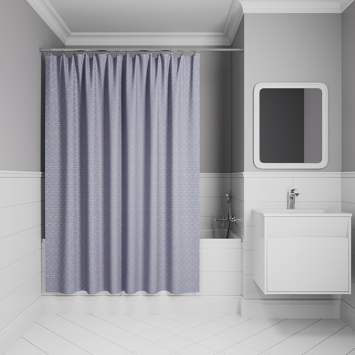 Размер (ВхШ): 200х240 см. Mматериал: 100% полиэстер, плотность 80 г/м, водоотталкивающая пропитка, прозрачные пластиковые люверсы, 12 прозрачных пластиковых колец, форма "С", утяжеляющая нить, упаковка ПВХ пакет, картонный топпер, пластиковый крючок.