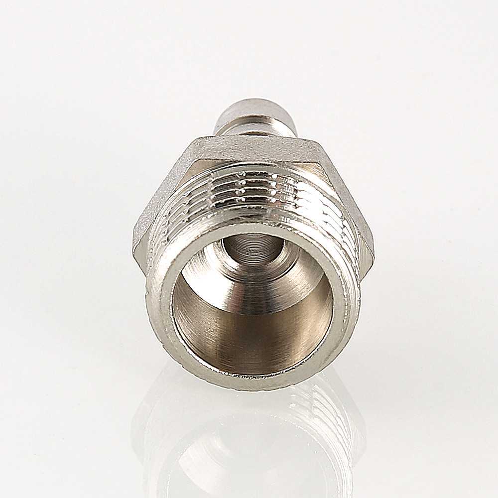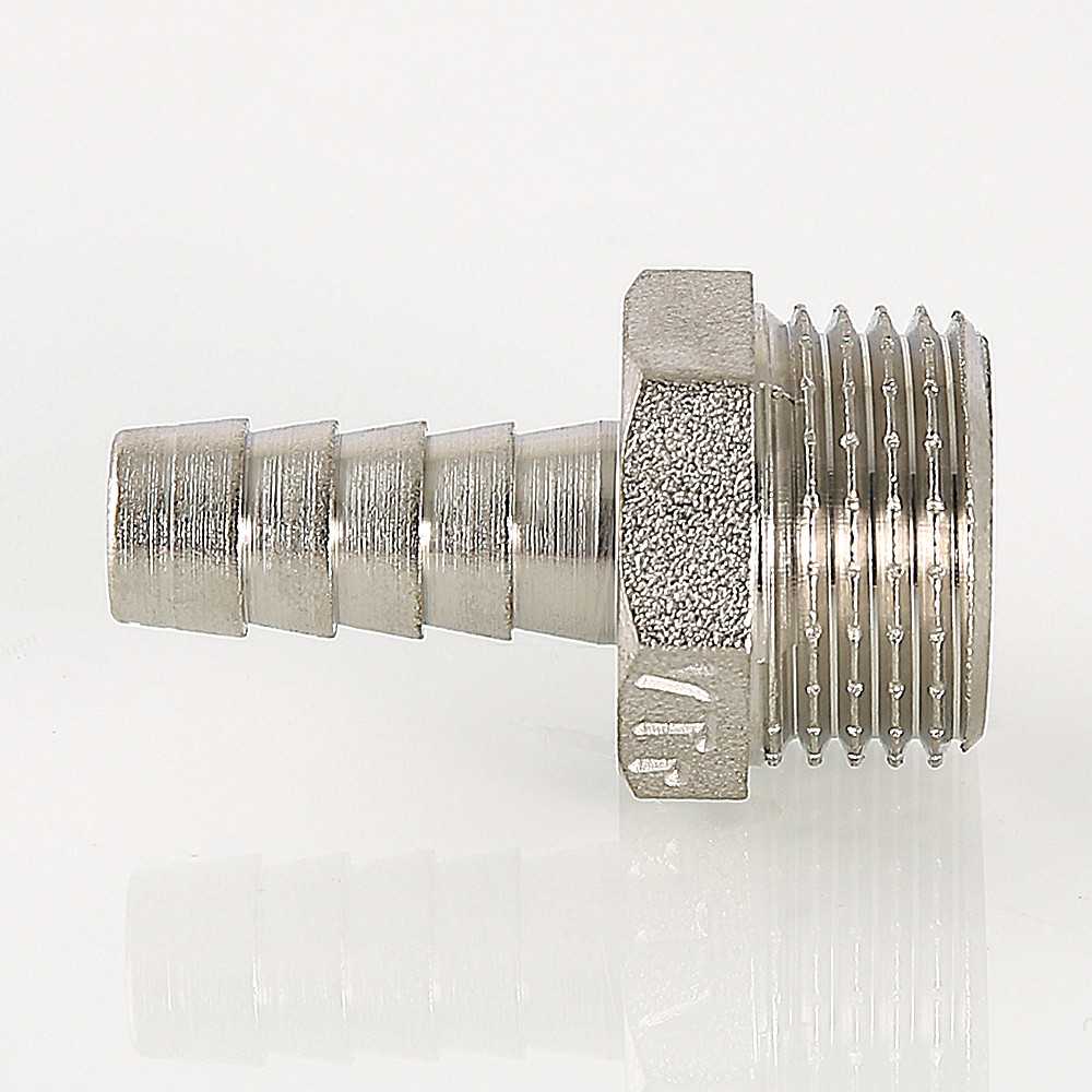 Основное назначение резьбового фитинга со штуцером – подключение к водозапорной арматуре, непосредственно к трубопроводам поливочного шланга. Изделие можно применять также в других системах с неагрессивной к используемым материалам рабочей средой (горячая вода, незамерзающий теплоноситель, сжатый воздух и т.д.). Фитинг выполнен из сантехнической латуни CW617N, защищенной никелевым гальванопокрытием. Присоединительный патрубок снабжен цилиндрической трубной наружной резьбой с насечками для лучшего удержания герметика. Штуцер для шланга имеет конфигурацию, эффективную для его фиксации. Присоединение шлангов необходимо производить с помощью плоских обжимных хомутов.