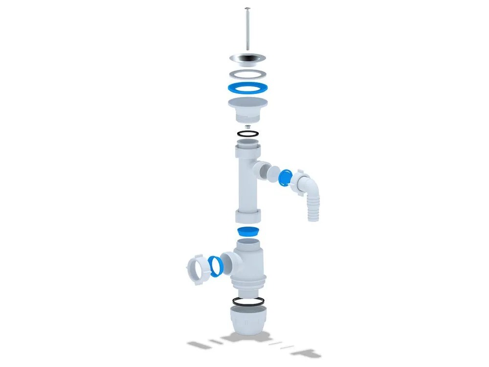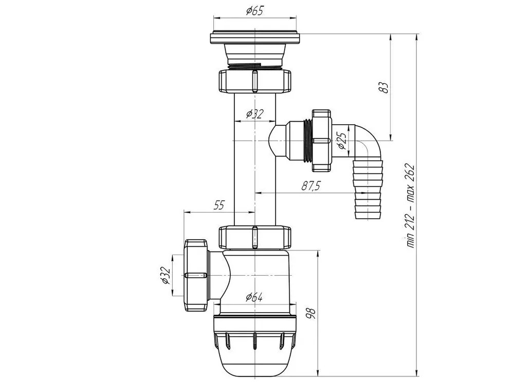 Сифон для умывания бутылочного типа с уменьшенным корпусом, с отводом для подключения бытовой техники. Выход для подключения к канализации 32мм