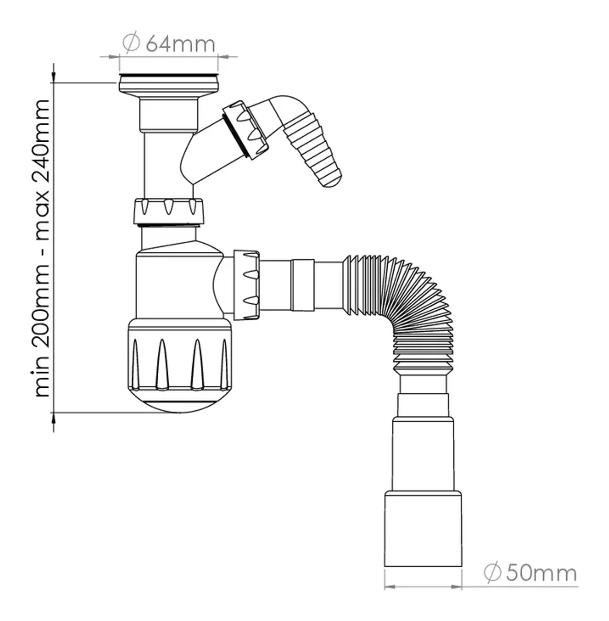 Сифон 32 мм бутылочный Nova с выпуском 1 1/4"х64 мм с 1-им отводом и гибкой трубой 1 1/4"х40/50 (1056)