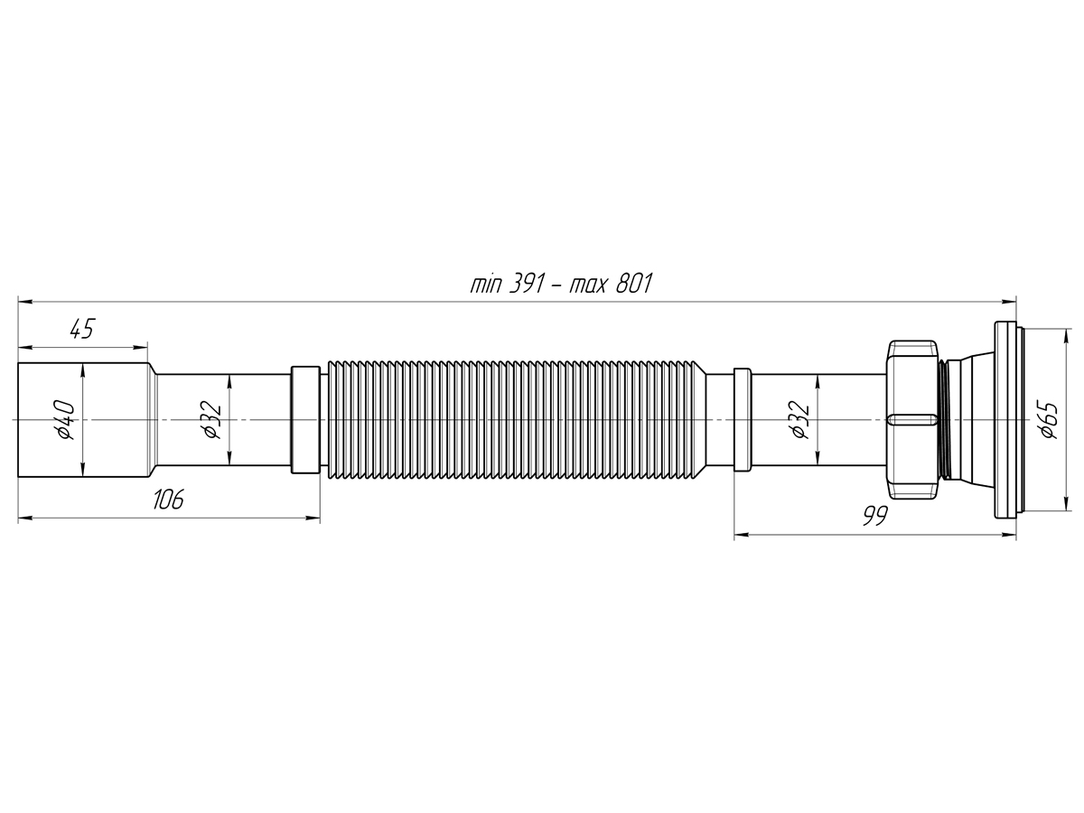 Сифон 32 мм. гофрированный с выпуском 1 1/4"(65 мм.)*32/40 АНИ (391-801 мм.) АНИ пласт (G207)