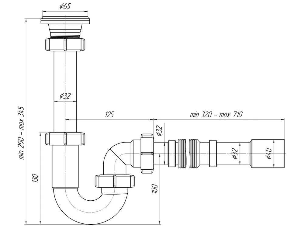 Комплектация: сифон, гибкая труба для подключения к канализации 32*32/40 мм, упаковка.