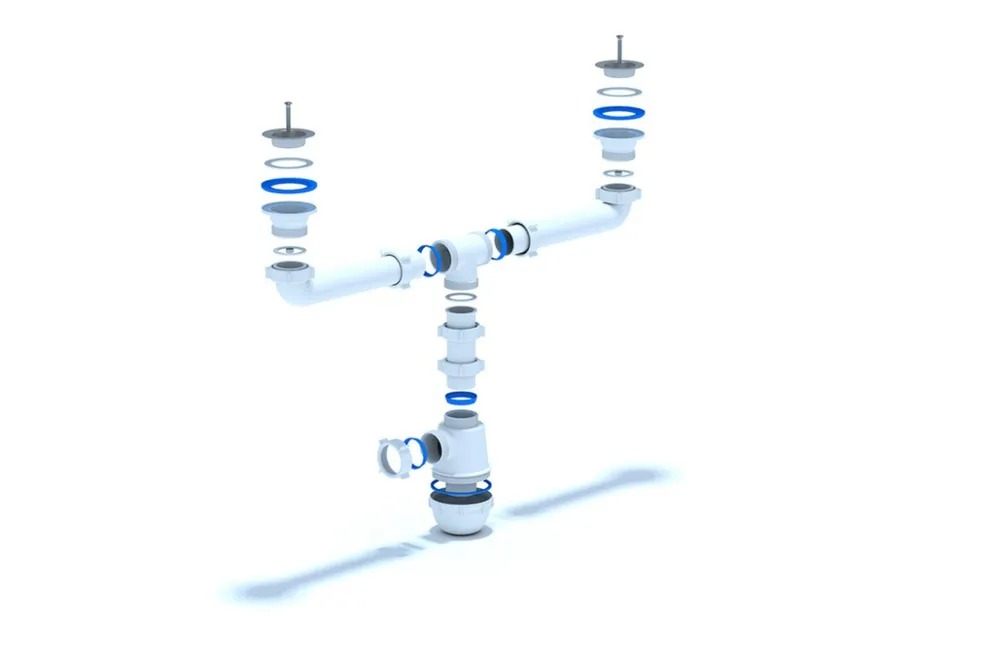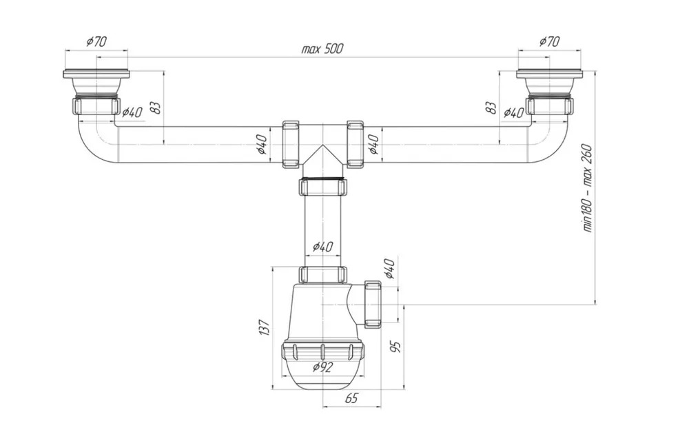 Сифон для кухонной мойки с двумя чашами и сливными отверстиями 50мм. Выход для подключения к канализации 40мм