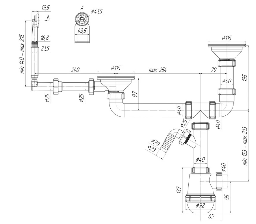 Сифон для кухонной мойки с двумя чашами разного уровня, сливными отверстиями 90мм. Выход для подключения к канализации 40мм