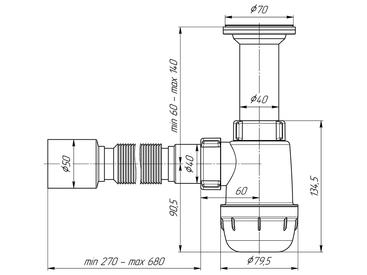 Сифон 40 мм. бутылочный АНИ "Грот" с литым выпуском 1 1/2"*70 мм. с гибкой трубой 40*50 АНИ пласт (A0510)
