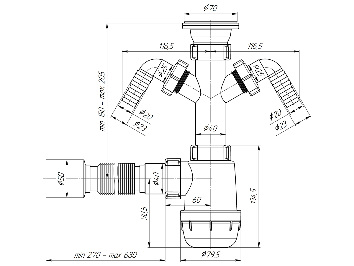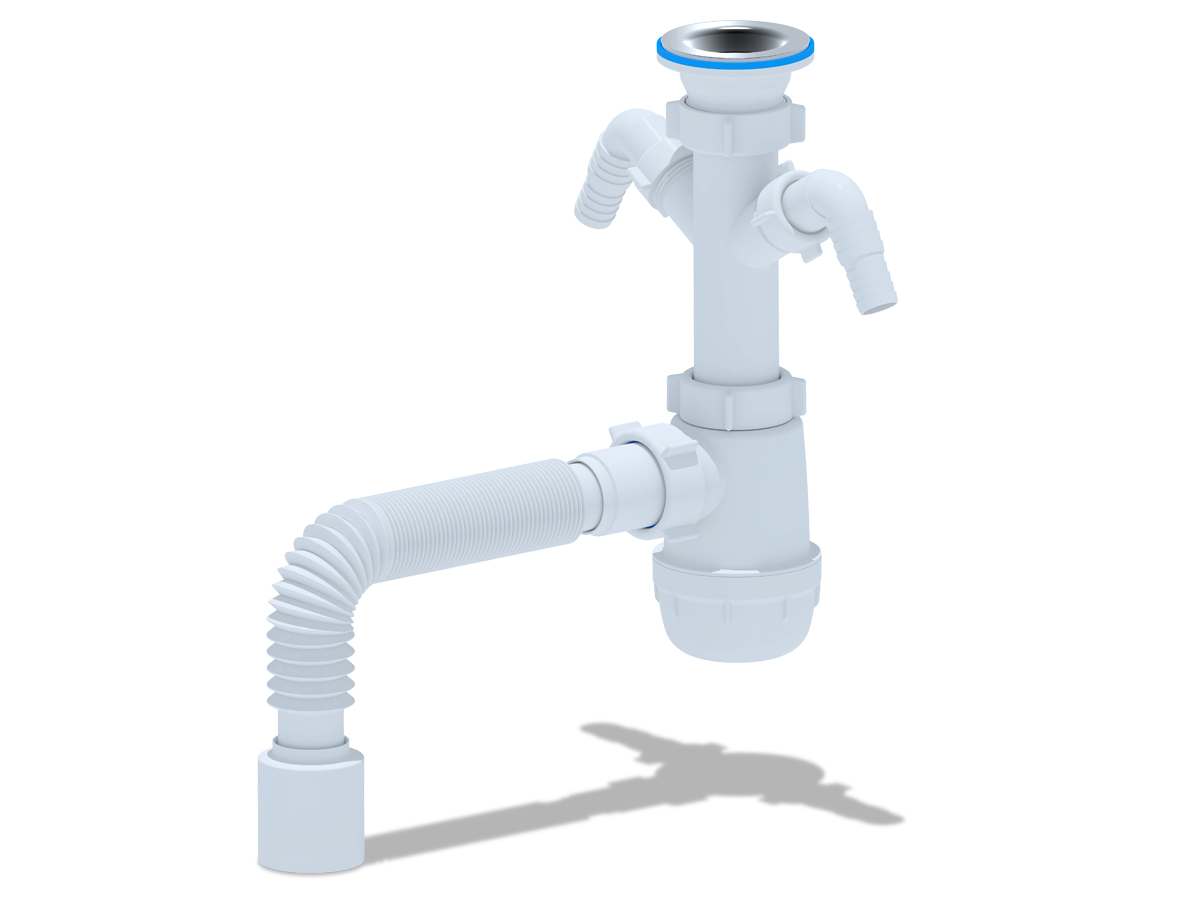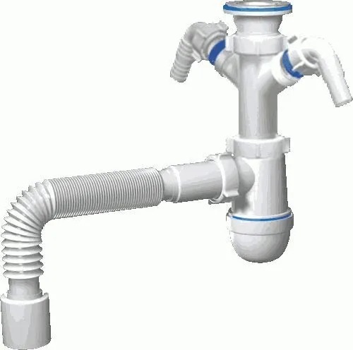 Сифон для кухонных моек с диаметром сливного отверстия 50мм, бутылочного типа с увеличенным корпусом. С разборным выпуском и нержавеющей решеткой, с двумя отводами для подключения бытовой техники. Для подключения к канализации комплектуется гибкой трубой 40*50мм