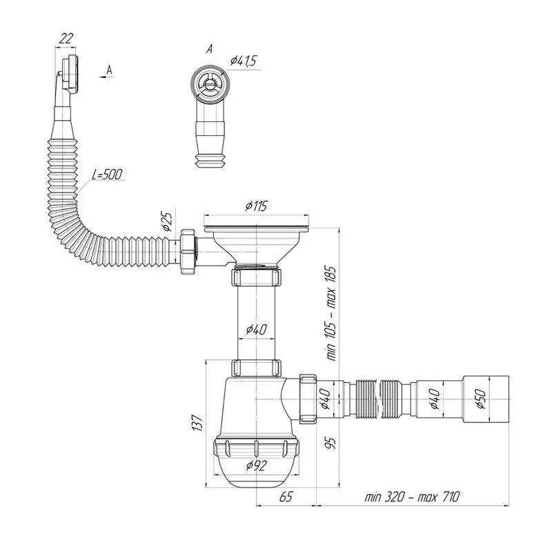 Сифон 40 мм. бутылочный АНИ "Грот" с выпуском 3 1/2"*115 мм. с гибким круглым переливом, с гибкой трубой 40*40/51 АНИ пласт (A0142SA15)