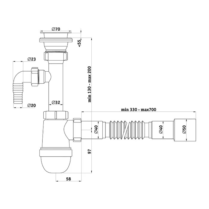 Сифон 40 мм. бутылочный АНИ с выпуском 1 1/2"*70 мм. с отводом для стир.машины, с гибкой трубой 40*40/50 АНИ пласт (C0315)