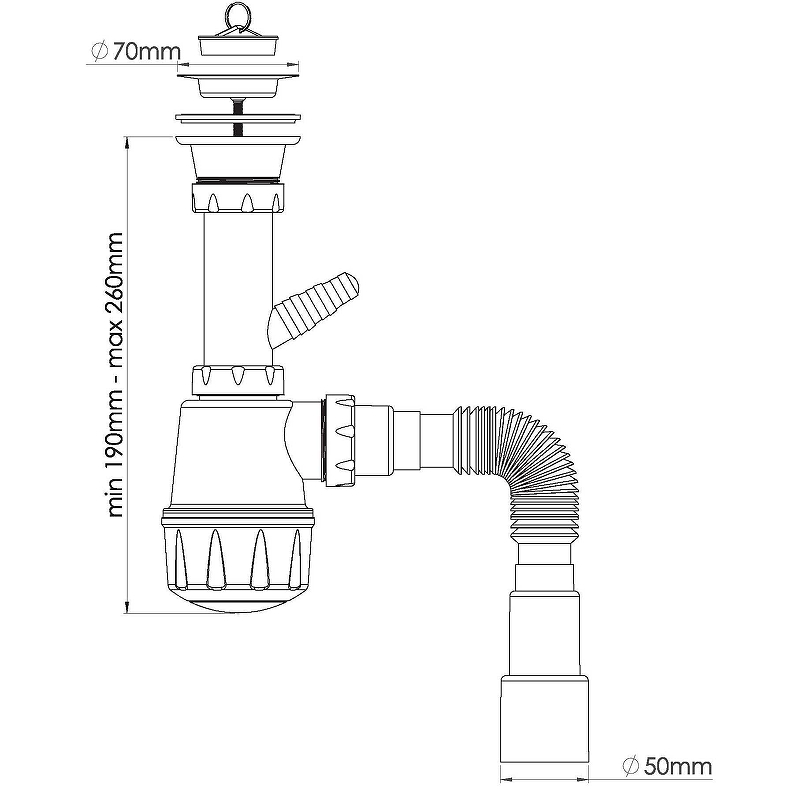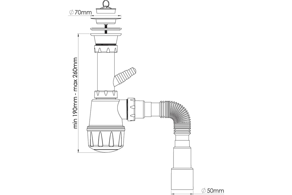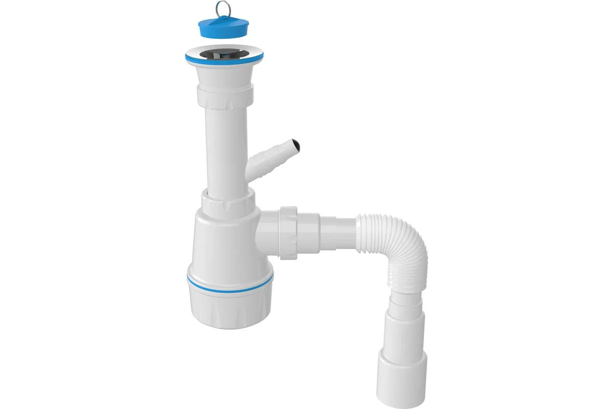Сифон 40 мм бутылочный Nova 1 1/2"х70 мм с 1-им отв. и гибкой трубой 1 1/2"х40/50 (1061)