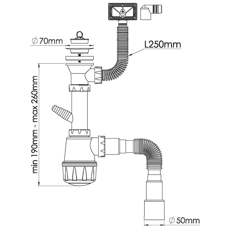 Корпус и гофротруба сифона изготовлены из высококачественного первичного полипропилена на современном оборудовании. Металлическая часть выпуска сифона и болт изготовлены из нержавеющей стали марки AISI 304, обеспечивает невозможность их окисления. Конструктивной особенностью гайки является то, что она выполнена из латуни и имеет резьбу для крепления к корпусу выпуска сифона, болт в выпуске выполнен из нержавеющей стали 304 марки.
