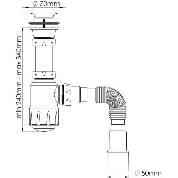 Сифон 40 мм бутылочный Nova с разборным выпуском 1 1/2"х70 мм с гибкой трубой 1 1/2"х40/50 (1051)