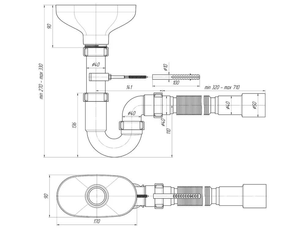 Комплектация: сифон, приемная воронка, гофротруба 40х50 мм