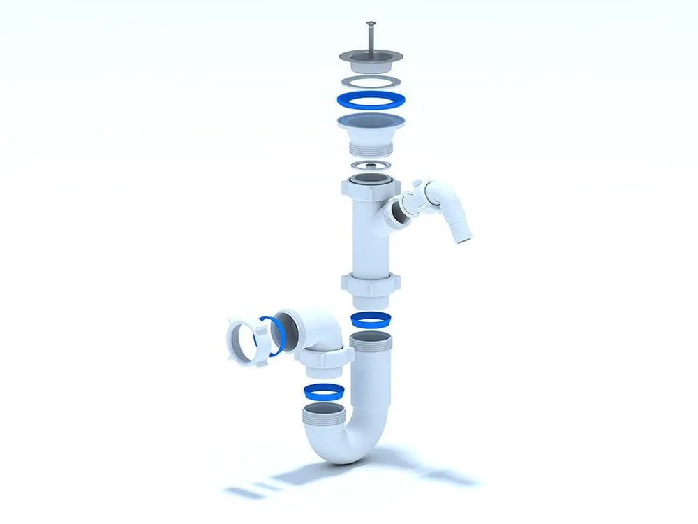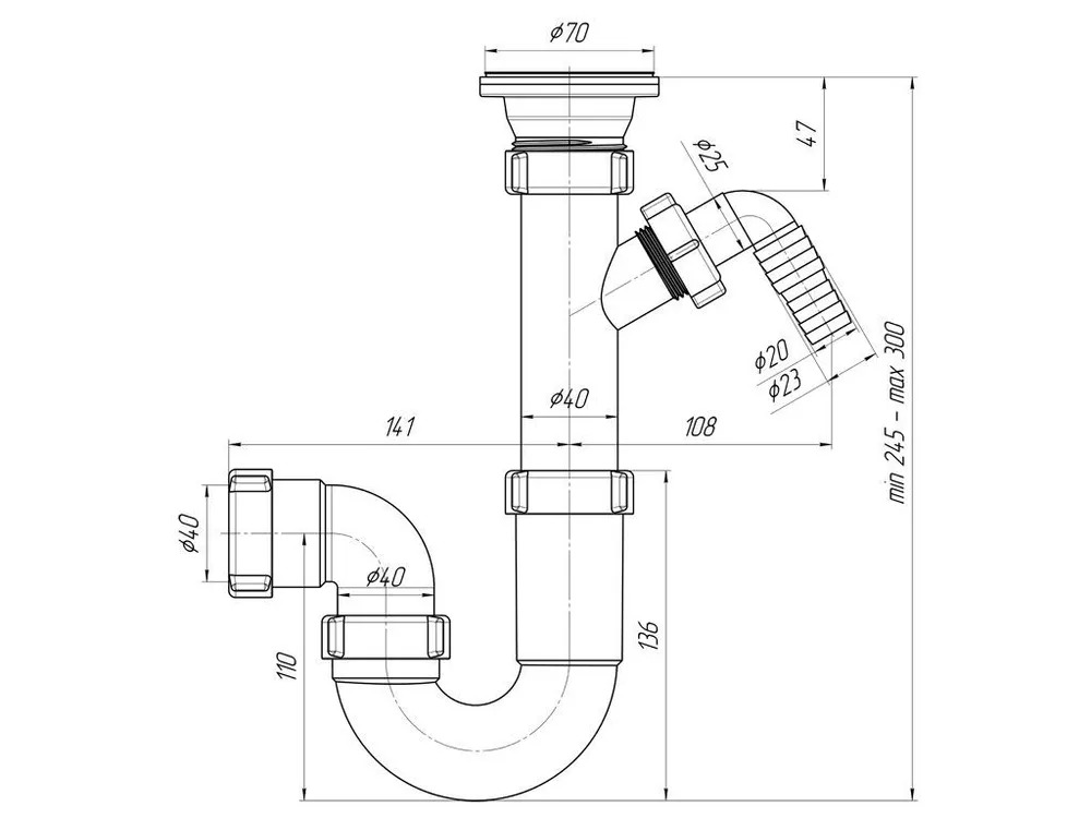 Сифон для кухонной мойки с диаметром сливного отверстия 50мм, прямоточного (проточного, трубного) типа. С разборным выпуском и нержавеющей решеткой, с отводом для подключения бытовой техники. Выход для подключения к канализации 40мм