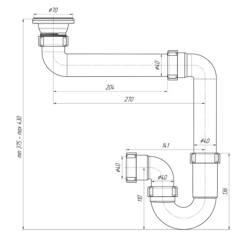 • Сифон сливной АНИ пласт D5000 смещенный для кухонной мойки с диаметром сливного отверстия 50-60 мм