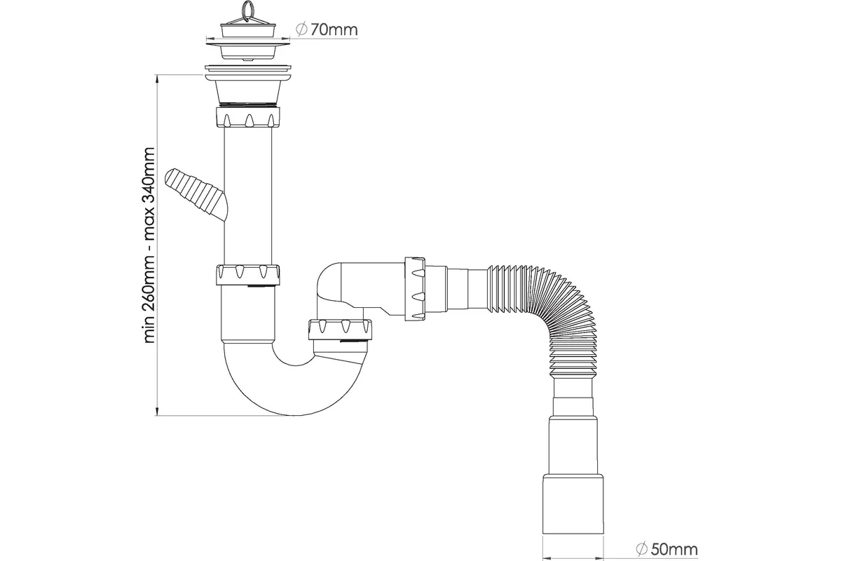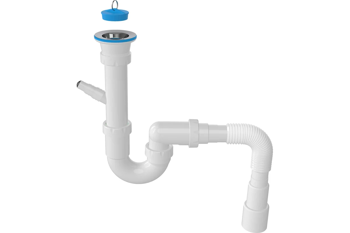 Сифон 40 мм. трубный Nova с выпуском 1 1/2"х70 мм., с 1-им отводом и гибкой трубой 1 1/2"х40/50 (1122)
