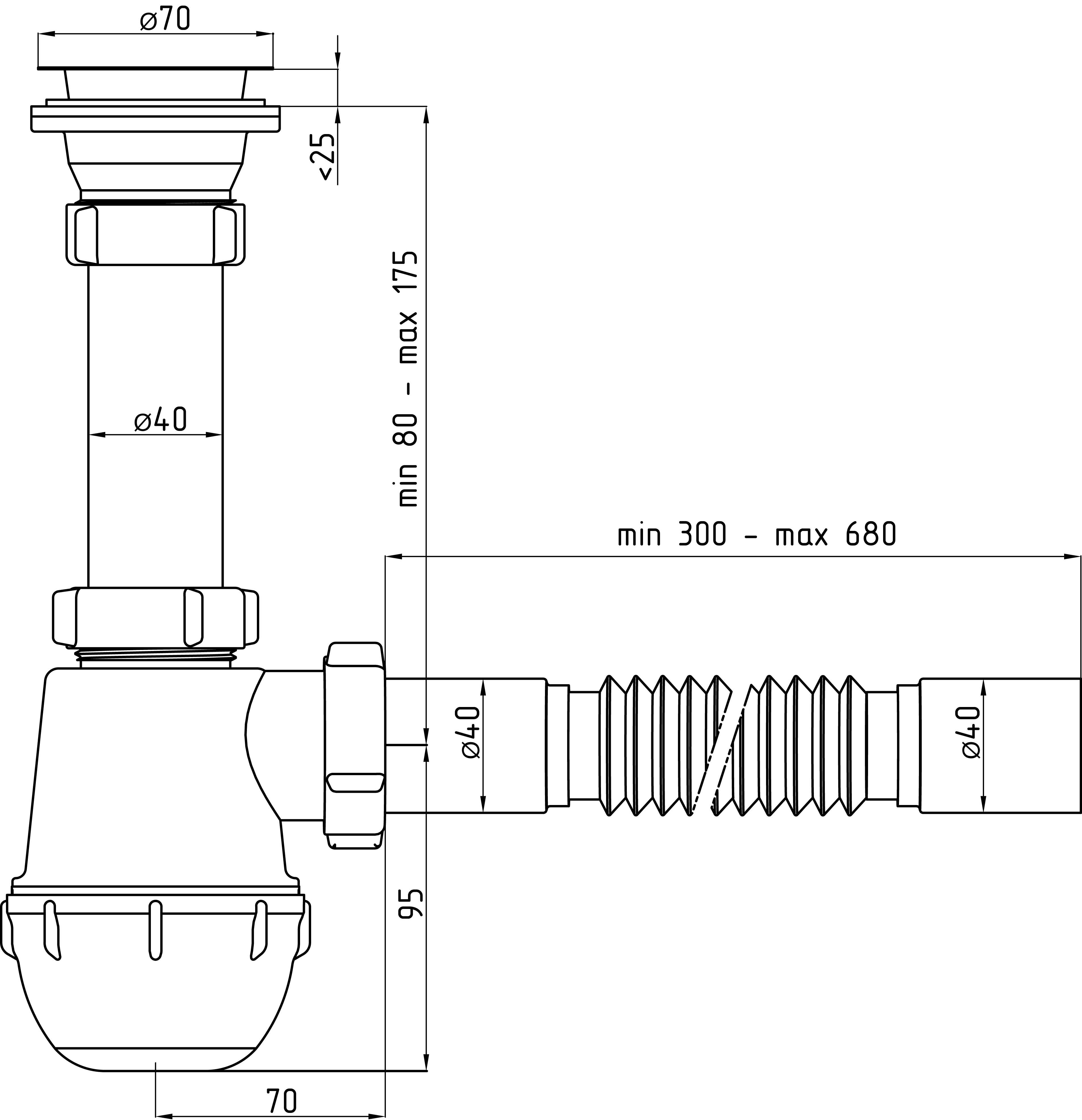 Сифон 40 мм. бутылочный АНИ "Грот" с выпуском 1 1/2"*70 мм. с гибкой трубой 40*50 АНИ пласт (A0110)
