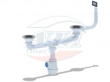 Сифон для кухонной мойки с двумя чашами и сливными отверстиями 90мм. Выход для подключения к канализации 40мм.