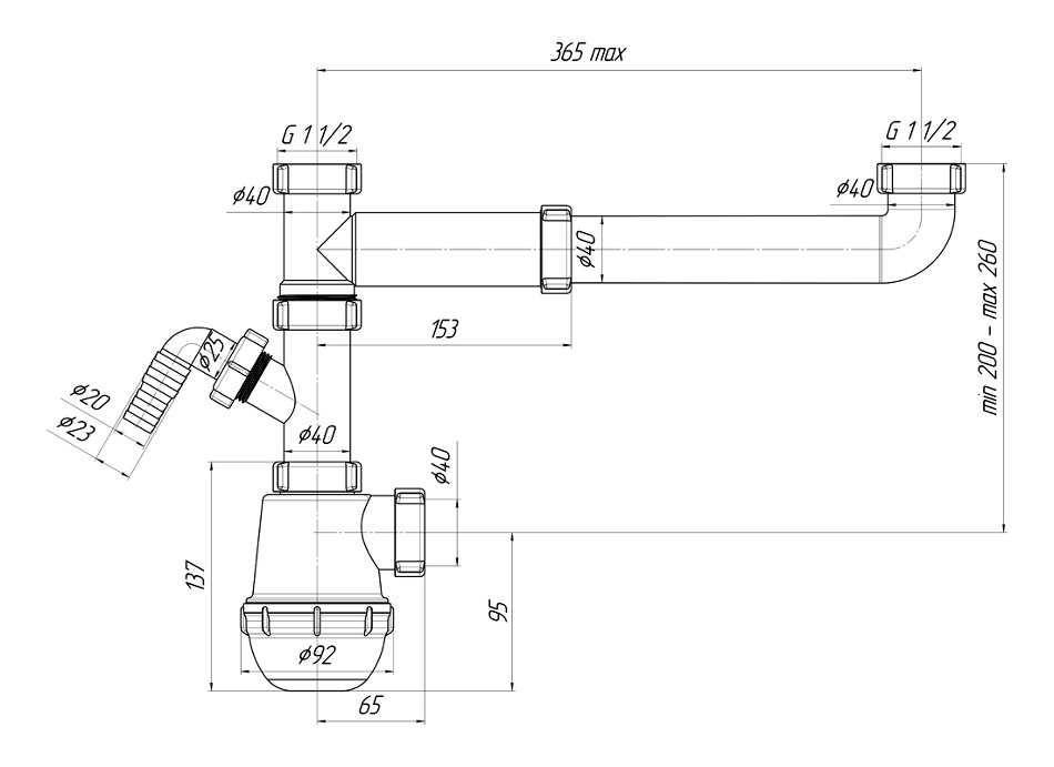 Данный сифон имеет увеличенный корпус для улучшения пропускной способности, величина гидрозатвора составляет 60 мм.