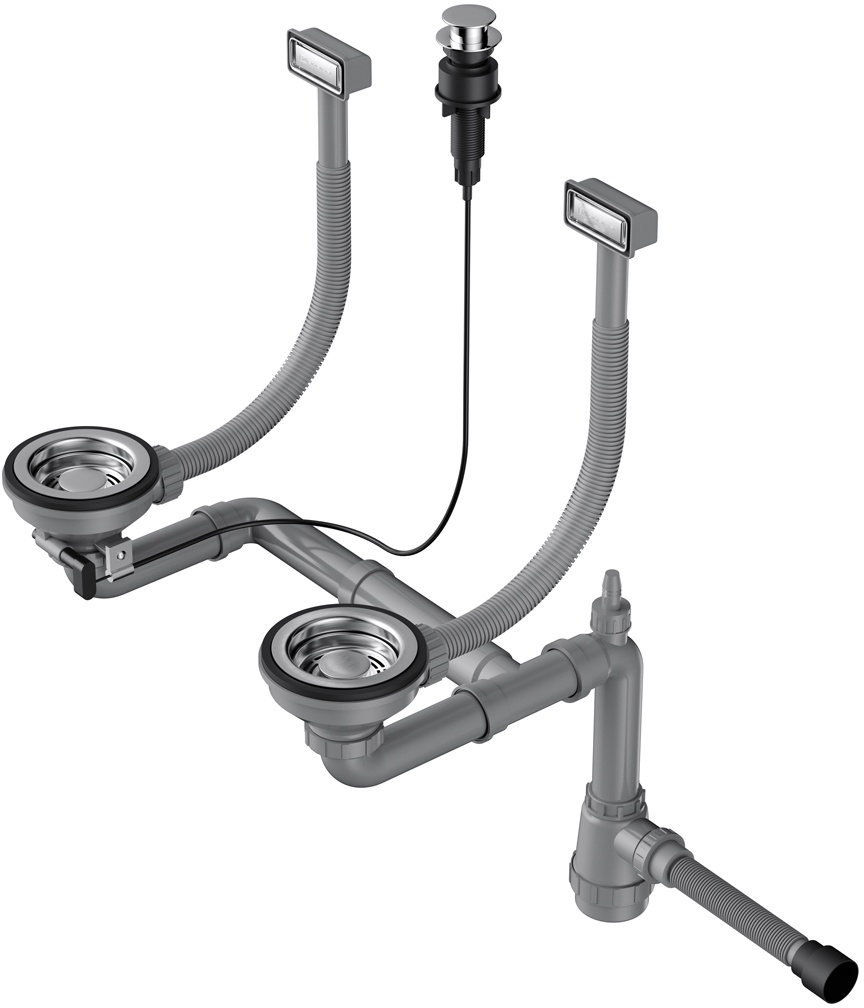 Арматура для двухчашевых моек с прямоугольными переливами, декоративными решетками и клапаном-автомат. Подходит для моек из серии AKISAME.
