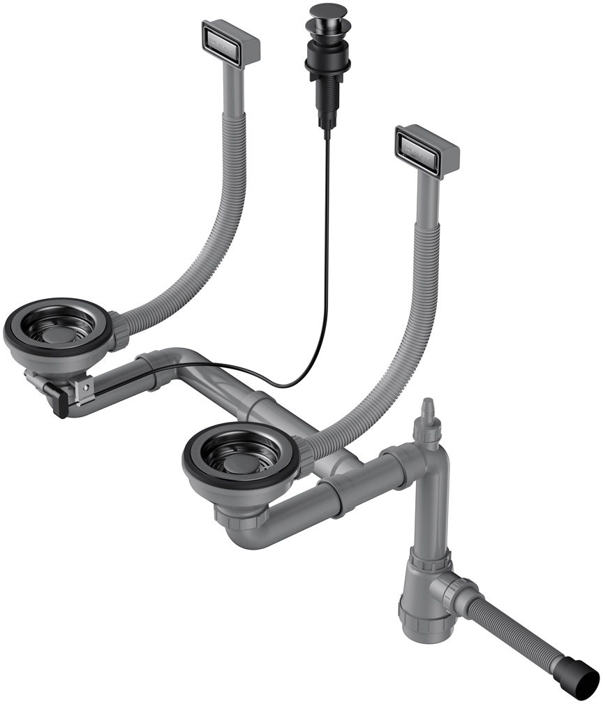 Арматура для двухчашевых моек с прямоугольными переливами, декоративными решетками и клапаном-автомат. Подходит для моек из серии AKISAME.