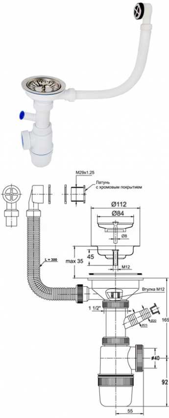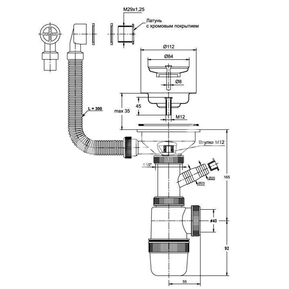 Сифон для гранитной мойки Wirquin с отводом для стиральной машины и переливом 30986177