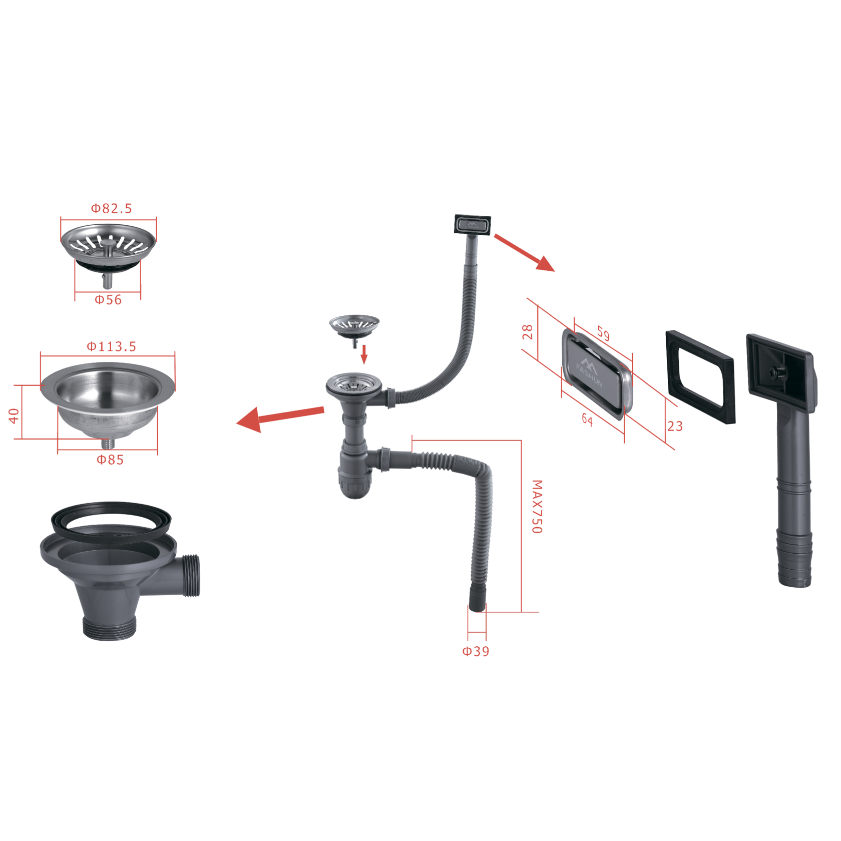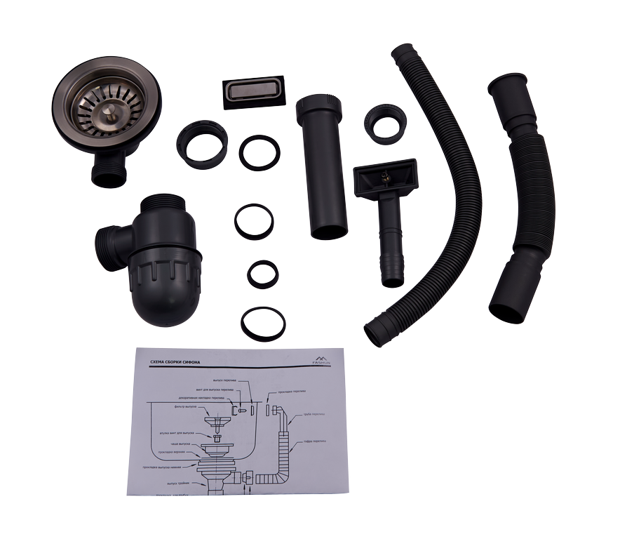 комплект: дренажный фильтр D=56/82,5 мм, нержавеющая сталь, сатин, полный комплект гофро-труб, ABS пластик, серый