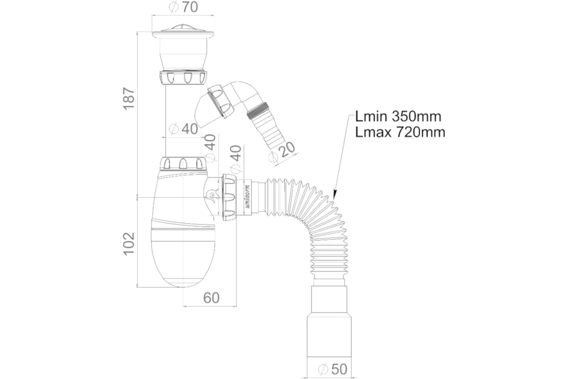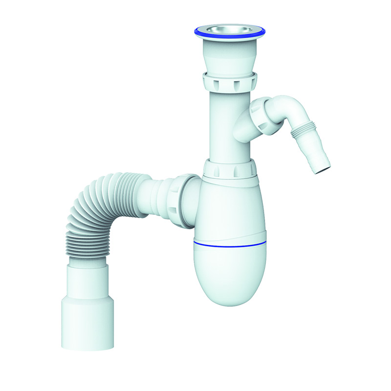 Сифон для мойки с прикрученным выпуском 1 1/2"x40 под стиральную и посудомоечную машины гибкий отвод Unicorn В320V