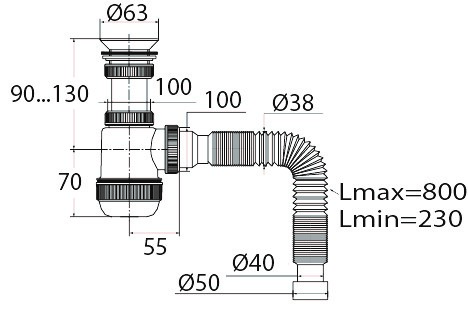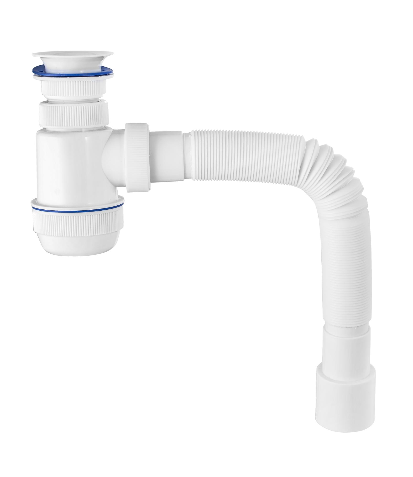 Сифон VIR ""МИНИ Элит"" арт.6710 бутылочного типа для моек и умывальников с нержавеющим выпуском, в комплекте с гибкой трубой 40х40/50. ""МИНИ"" означает уменьшенную версию бутылочного сифона, что позволяет существенно экономить место под умывальником.