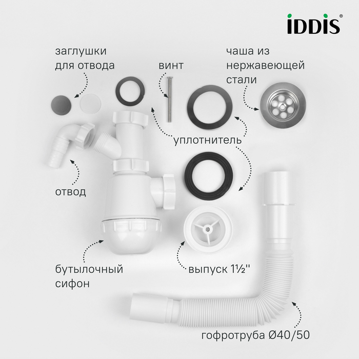 Сифон для раковины Iddis 1 1/2"x40 с выпуском гофротрубой 40/50иотводом (900AVG1010VD)